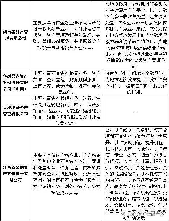 資產管理公司對不良資產的處置需要運用到多種手段,因此,開展相關業務輔佐不良資產的處置就顯得尤為重要。但由于各地方AMC的定位不同,其所開展的主要業務也有所差異,例如有些地方AMC將自身定位為地方不良資產的“收集器”,因此主要以收購不良資產業務為主;而有些地方AMC則側重于解決地方政府和國有企業的不良資產問題,在開展不良資產業務的同時還開展結構化業務;還有部分地方AMC以市場化的資金業務為主,將自身打造為地方綜合金融服務平臺。具體如下表所示: