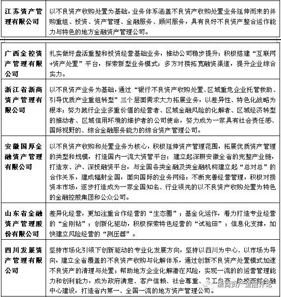 從整體上來看,地方AMC圍繞著不良資產處置這一基礎業務開展了多種相關業務,通過設立基金、不良資產證券化、債轉股和并購重組等方式對不良資產處置鏈進行挖掘。而從業務拓展上升到戰略層面,各地方AMC也都在積極的整合當地資源,與地方政府、銀行和其他金融機構尋求合作,并根據地緣特征和相關的股東背景,發掘區域內潛在的市場需求,開展“區域專屬”業務,形成自身的業務特色。部分地方AMC的經營戰略如表7所示。