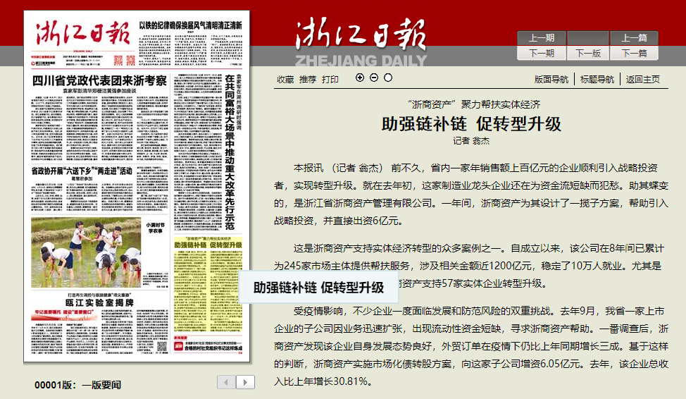 受疫情影響,不少企業一度面臨發展和防范風險的雙重挑戰。去年9月,我省一家上市企業的子公司因業務迅速擴張,出現流動性資金短缺,尋求浙商資產幫助。一番調查后,浙商資產發現該企業自身發展態勢良好,外貿訂單在疫情下仍比上年同期增長三成。基于這樣的判斷,浙商資產實施市場化債轉股方案,向這家子公司增資6.05億元。去年,該企業總收入比上年增長30.81%。