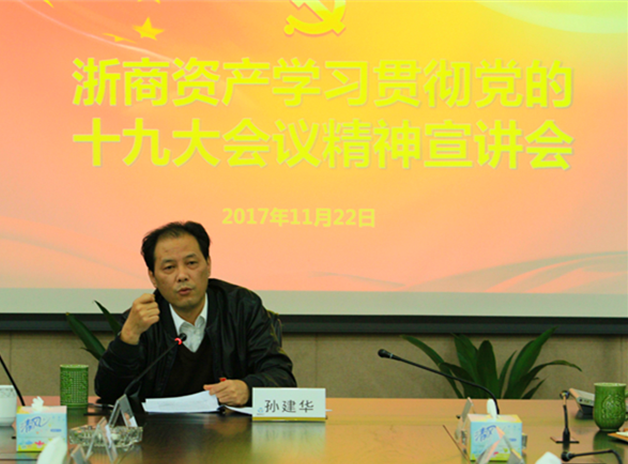 孫建華書記要求,要在十九大精神的指引下,推動浙商資產加速發展。一要牢牢把握十九大對國有企業的有關論述,按照“培育一流企業”要求,更高標準、更高要求制定戰略規劃,堅持勇立潮頭,盡快打造資產管理公司全國性品牌;二要對照金融領域作出的針對性部署,助力解決不平衡不充分的發展、助力省委提出的鳳凰計劃、助力集團產業共融發展,把服務實體經濟作為天然使命,擔起責任、有所作為;三要根據十九大精神,研究如何提升公司競爭力的問題,在站穩資本優勢的基礎上,依靠出色業務能力,做好企業文化,提升品牌影響力;四要補齊工作短板,按照上市公司標準和監管部門對四大AMC公司監管標準這“兩個標準”,拉高標桿,穩健推進制度、管理和信息化等工作;五要加強黨的建設,把黨領導一切和公司工作結合起來,抓好領導班子、黨支部和黨員隊伍建設,努力在黨建工作方面出成效、亮名片;六要深化人才隊伍建設,在關心人才、提供平臺等方面下功夫,不斷優化引才育才用才的良好環境,把各方精英吸收到公司來,打造人才高地。